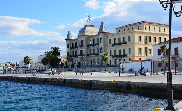 Departing from Spetses we see the Anargyreio Korgialenio School, one of the many offerings of Anargyros on the island, and the rich pine forest that touches the blue waters. -