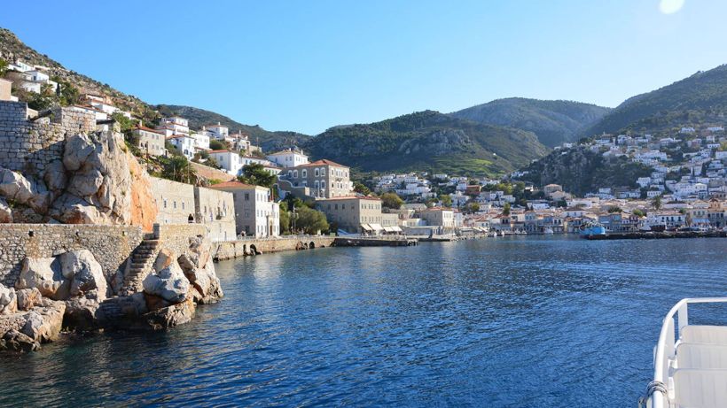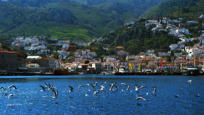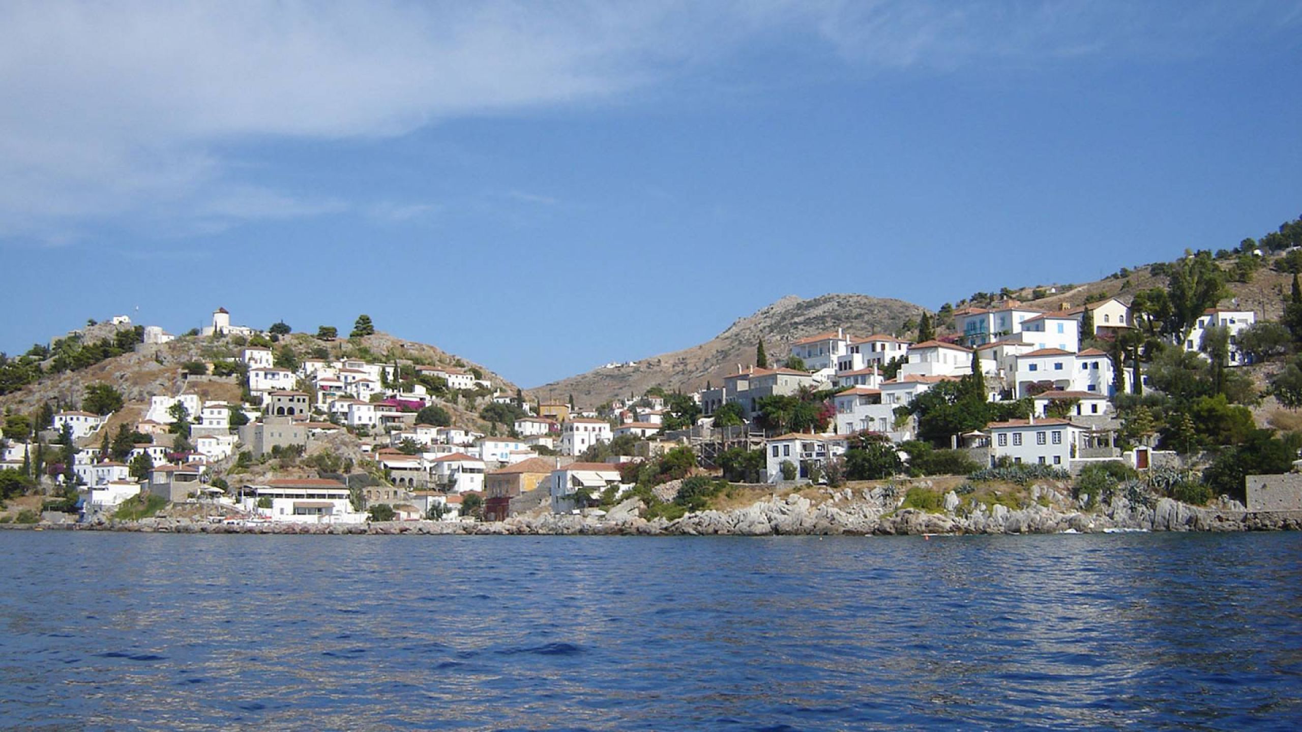 Hydra today appears like a painting all in grey, white and blue colours over the blue colour of